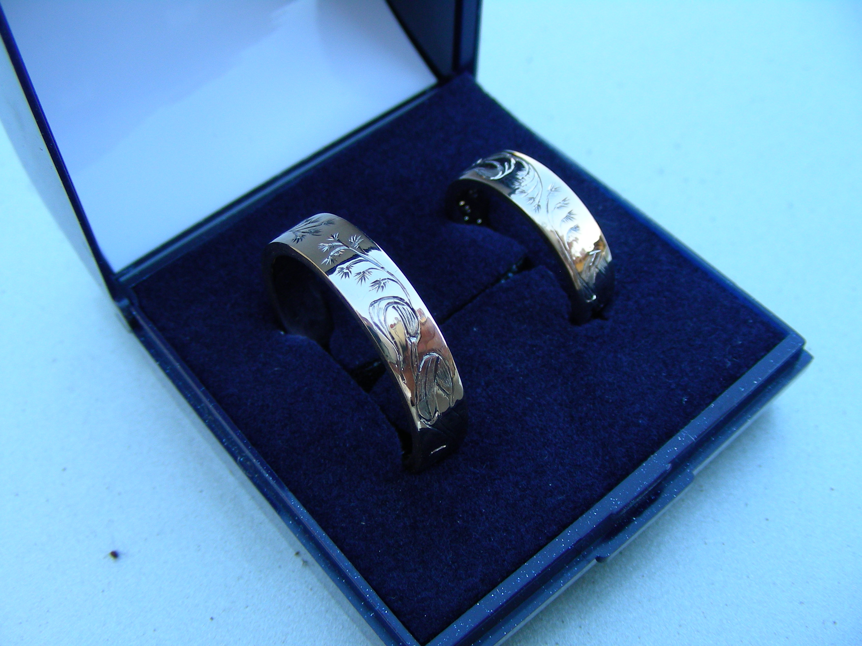 |  | Näihin sormuksiin päätimme tehdä flakkarungon , päälle piirsin ja kaiversin käsin järvikaislan kertomaan parin lapsuudenkotien sijainneen järven vastakkaisilla rannoilla, viimeistelin työn valkokultarodinoimalla kaiverruksen pohjan !