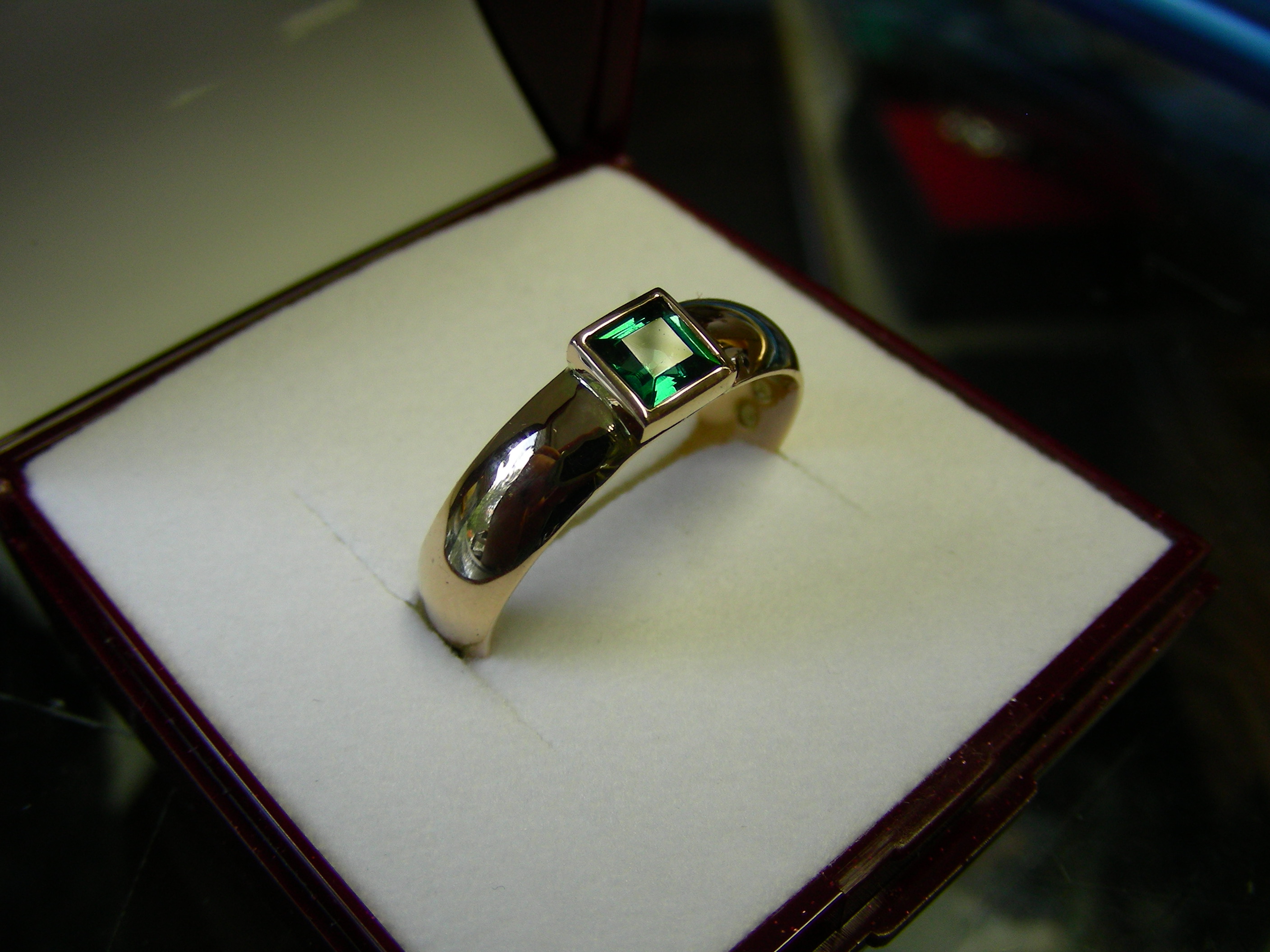|  | Tein Asiakkaan kierrätyskullasta puolipyöreän rungon , johon tein umpisarjan ja istutin todella kauniin princess, hionnalla olevan Smaragdin , tässäkin Asiakas maksoi vain työstä ja aidosta jalokivestä ,Taas kierrätystä aidoimmillaan!