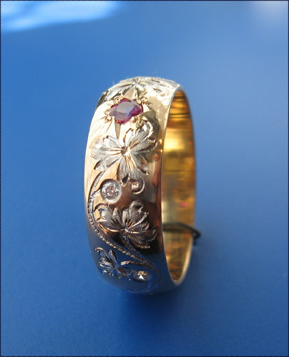 Uniikkityö, joka on tehty asiakkaan tuomasta vanhasta sormuksesta.Alunperin sileään sormukseen on tehty käsinkaivertamalla köynnös, johon on, kuin kastepisaroina, hiertotekniikalla istutettu neljä briljanttihiontaista Wessleton timanttia(4*0.02 W/VS Briljanttia). Kaiverruspohjaan on tehty valkokulta rodinointi ja katseenvangitsijaksi on istutettu tähti-istutuksella aito Rubiini. Lopputuloksena on yksilöllinen ja arvokas koru, joka kuljettaa mukanaan alkuperäistä perinnettä, mutta omaa samalla uutta loistoa ja modernia näköä.